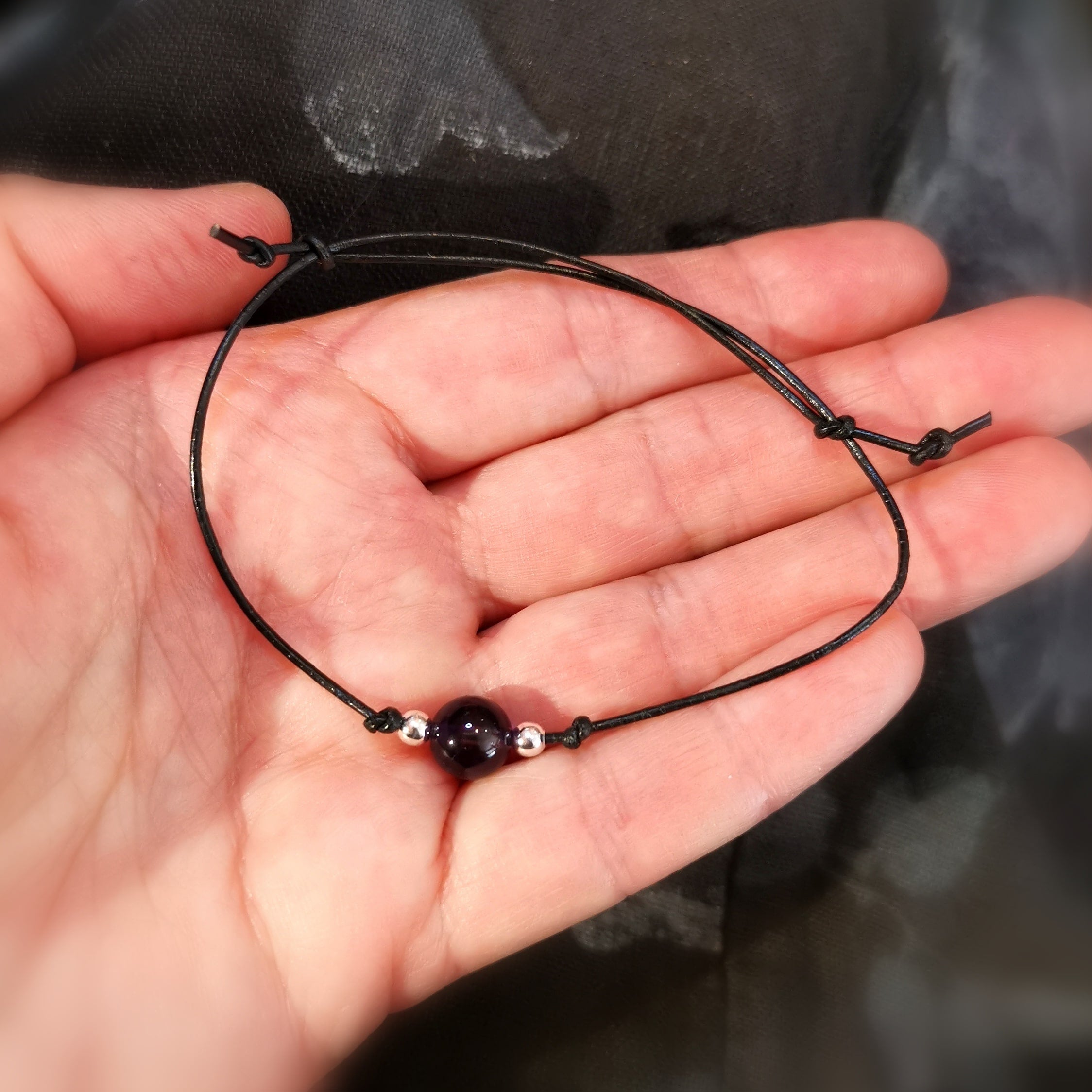 Edelstein Heilstein Qualität AA, 8 mm, tief lila farben, mit Sterlingsilber Perlen, auf schwarzem Leder, anschmiegsam