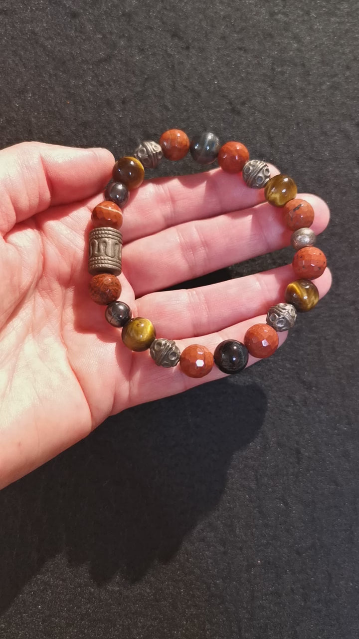 Kraftvoll: geweiht, Tigerauge Falkenauge Jaspis Karma Wurzelchakra Armband XL, Edelstein und Messing