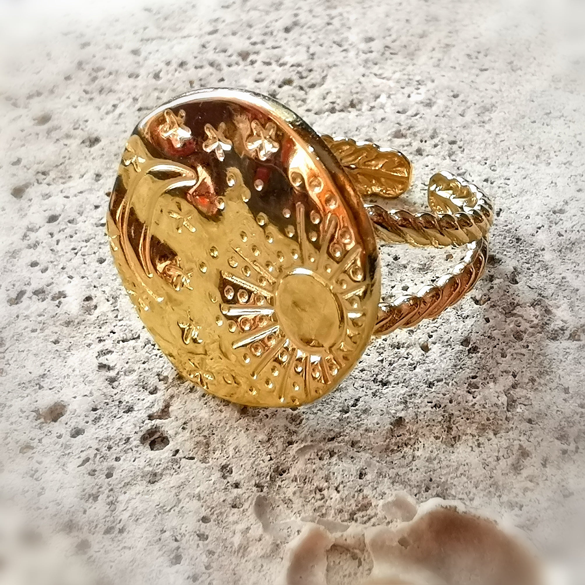 Planeten Ring Sonne Mond und Sterne, Boho Gold Karma Schmuck geweiht, 18k vergoldeter Edelstahl, offener Ring: Größe sanft einstellbar 54 - 58, Durchmesser 20 mm #Fingerring